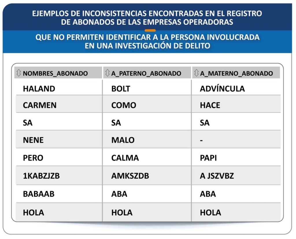Estos hallazgos se dieron durante la revisión de los datos del registro de abonados de las empresas operadoras para atender los requerimientos de información sobre la titularidad de servicios móviles para la investigación de delitos a cargo de instituciones públicas como el Ministerio Público, el Ministerio del Interior y el Poder Judicial.