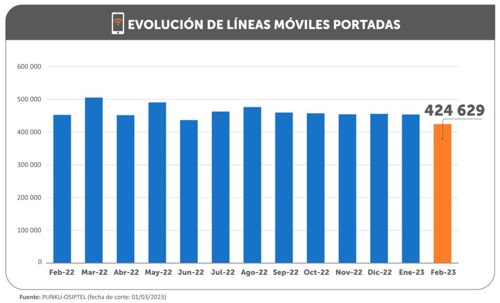 Un total de 424 629 líneas móviles cambiaron de empresa operadora en febrero del presente año, evidenciándose un retroceso de 6.17 % respecto al mismo periodo del año pasado, informó el Organismo Supervisor de Inversión Privada en Telecomunicaciones (OSIPTEL).